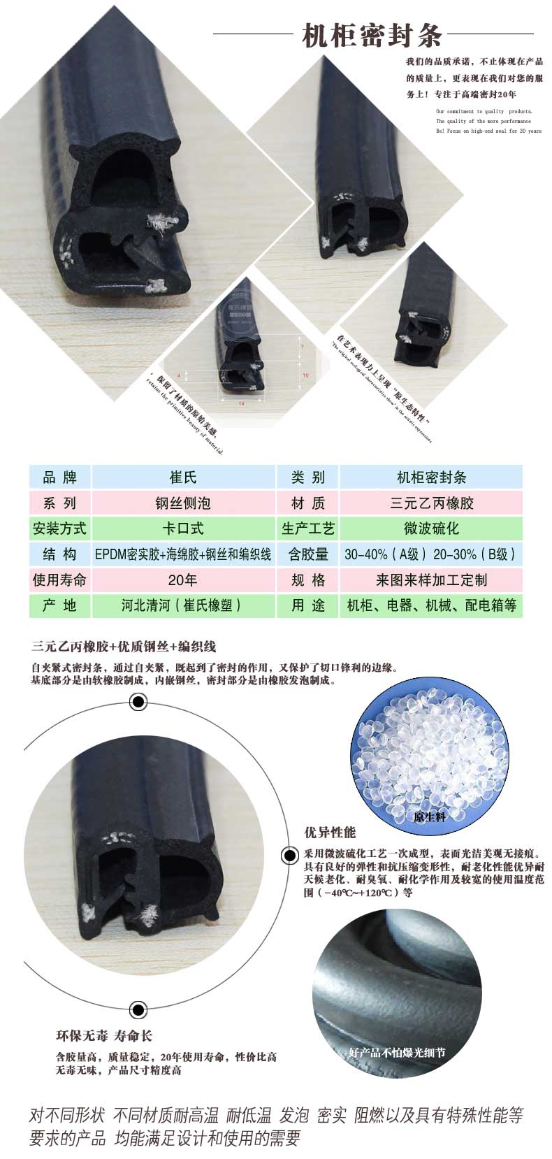 该产品在不妨碍机柜、机箱整体美观的前提下,增强了机柜、机箱的防风防水防火的性能,稳固了机柜装配结构,增强了机柜、机箱、电器的安全性能。目前国内使用最多的胶种是三元乙丙橡胶和热塑性三元乙丙橡胶(santoprene),有的厂家也选用硅橡胶和改性PVC。