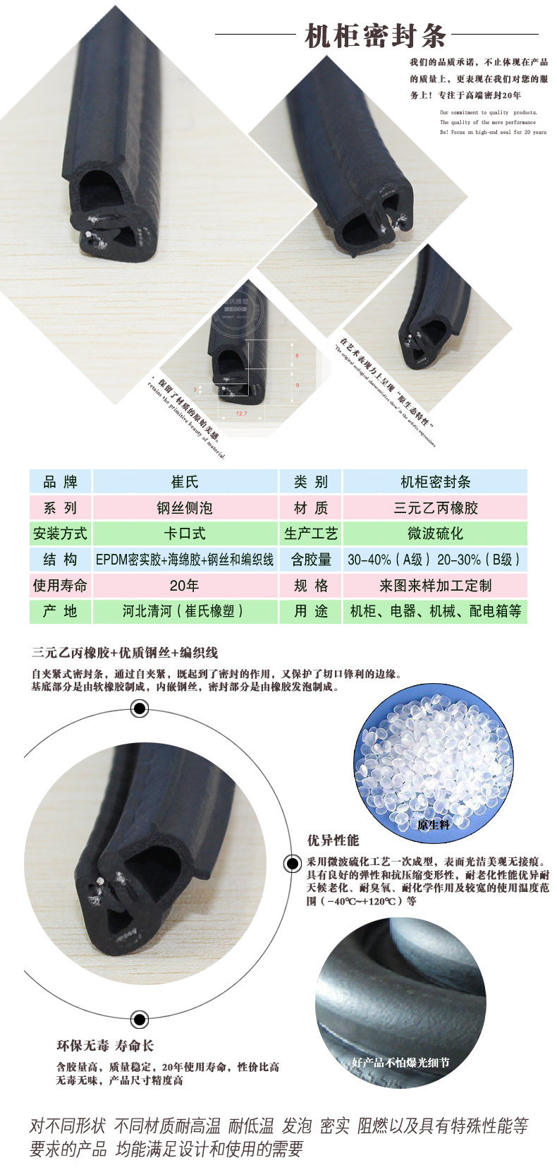 机柜防水胶条的产品详细介绍此机柜密封条是由具有良好弹性和抗压缩变形、耐老化、臭氧、化学作用、较宽的使用温度范围(-40℃~+120℃)的三元乙丙橡胶(EPDM)橡胶发泡与密实复合而成,内含独特的金属夹具和舌形扣,坚固耐用。在各种机柜上起着很关键的作用。