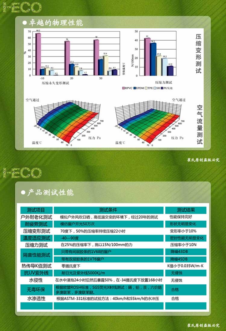包覆式密封条在耐老化、耐疲劳、压缩变形测试、压缩力测试、热传导K值测试、水侵性、水渗透性等测试中均取得超越所有传统产品的优秀的结果;同时包覆式密封条节能环保、隔音降噪、抗强紫外线,无毒、不与任何油漆、清洁剂发生反应,迎合新时代绿色健康主题。