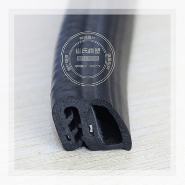 产品结构:门 框密封条不但要保证密封性,还要承受关门时的冲击力,因此它既要有弹性,也要有韧性,主要由密实胶基体和海绵胶泡管两部分组成。密实胶内含有金属骨架,起 到加强胶条的定型和固定作用。海绵胶泡管柔软并富有弹性,起着受压变形,卸压反弹的功能。此外,有一些密封条的唇边部分由彩色胶构成或者贴有织物,色调美 观有装饰作用。