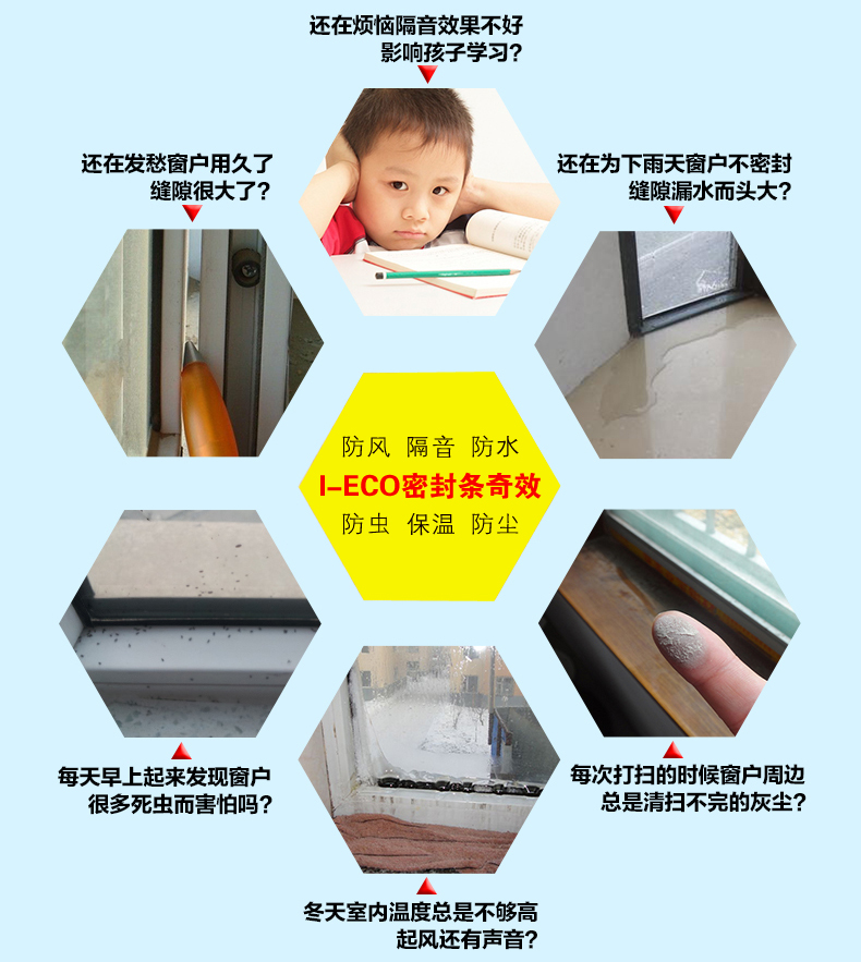无论铝合金门窗或实木门要使用门窗开关自如、防撞,门与窗的四周就必须有一定的缝隙,然而这些缝隙却给人们带来了许多干扰!有噪音、漏水、进灰尘等。门窗密封首选I-ECO包覆式密封条,独特的生产工艺以及环保的产品,多种型号可选,多种颜色更能贴合门窗色彩要求。